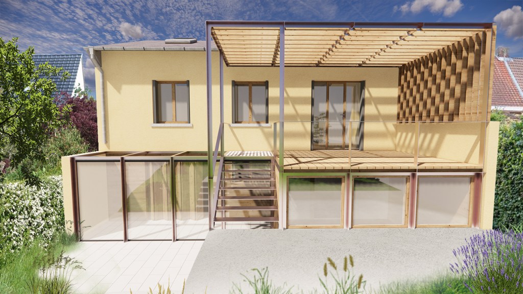 Projet d’extension pour une maison individuelle à Igny. Un nouveau salon a été pensé au rez-de-chaussée, venant compléter les pièces existantes pour créer une suite indépendante du reste de la maison. Une véranda s’ouvrant sur le jardin a également été ajoutée.