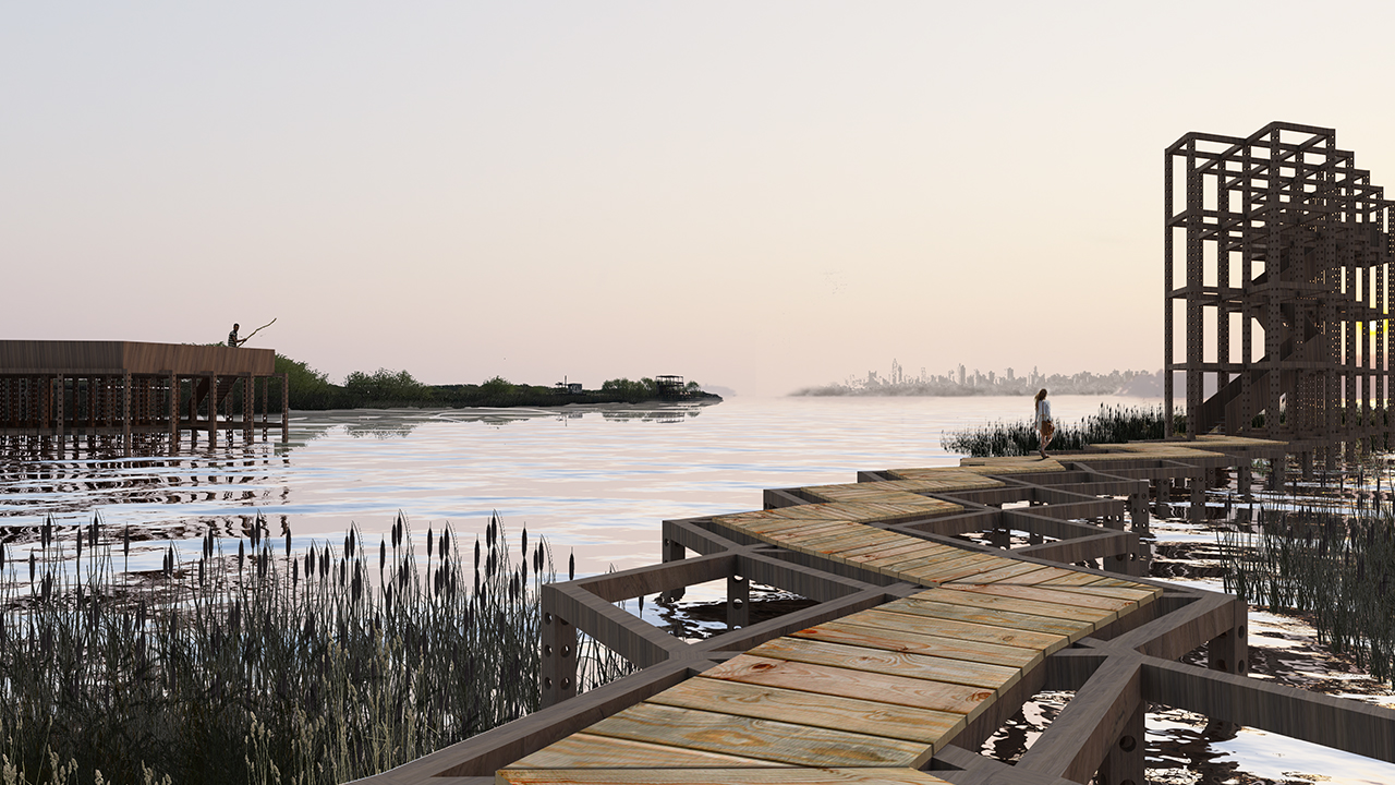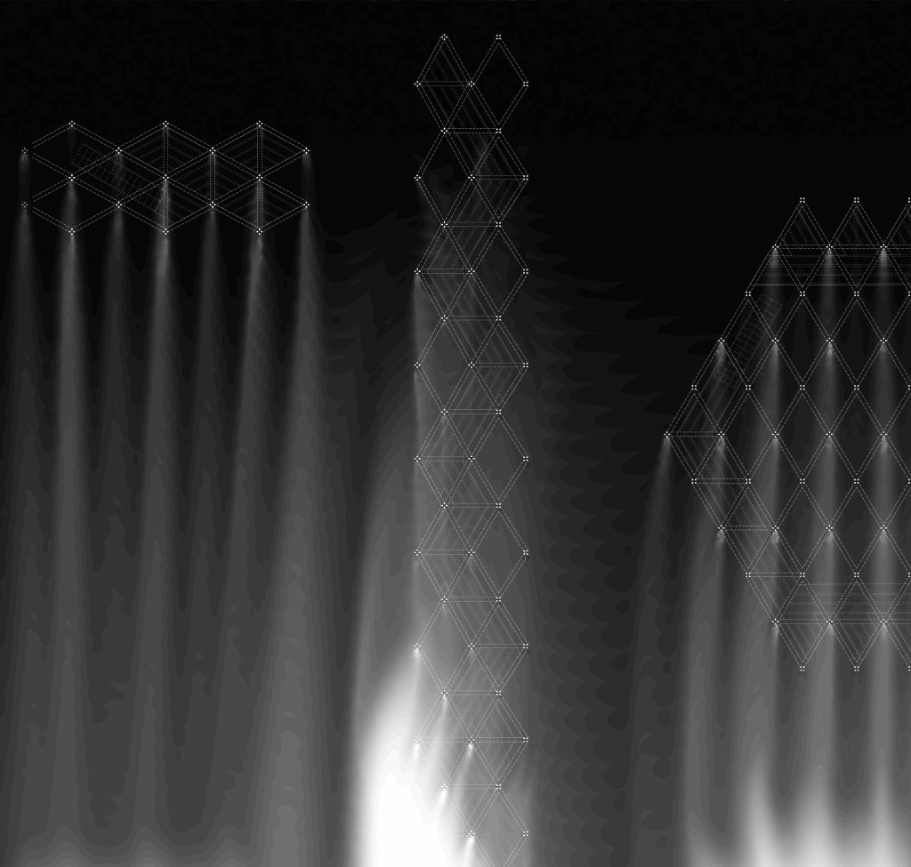 En réponse à ces grandes forces territoriales, le projet s’entend à deux échelles. Nous avons travaillé à l’échelle du détail à optimiser un pilotis ainsi qu’une trame structurelle afin de proposer un système constructif permettant de favoriser la sédimentation et d’agir en catalyseur de biodiversité. Les simulations de fluides et de déplacements de particules réalisées avec des logiciels d’ingénierie nous ont amené vers des poteaux troués placés selon une trame déphasée, ce qui provoque un ralentissement maximale de l’eau sans créer de turbulences et ainsi favoriser la sédimentation.