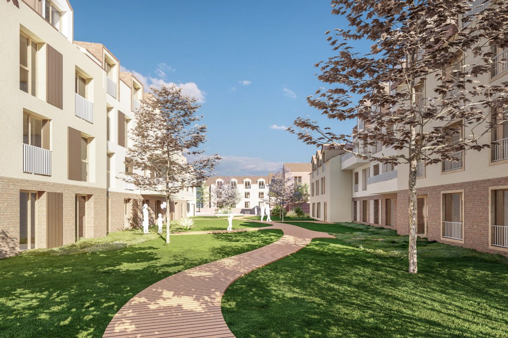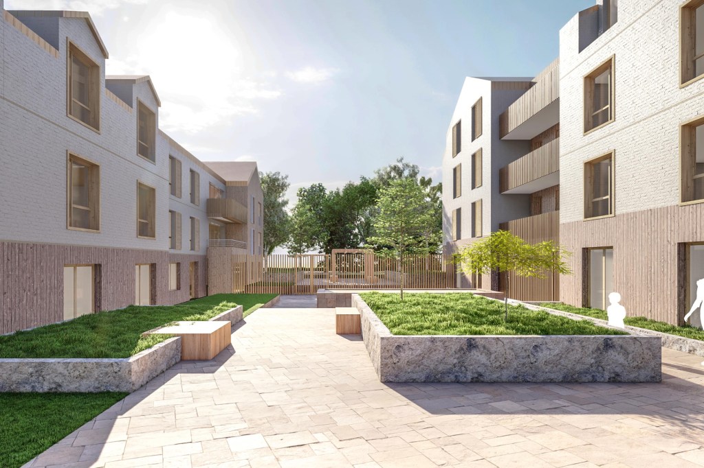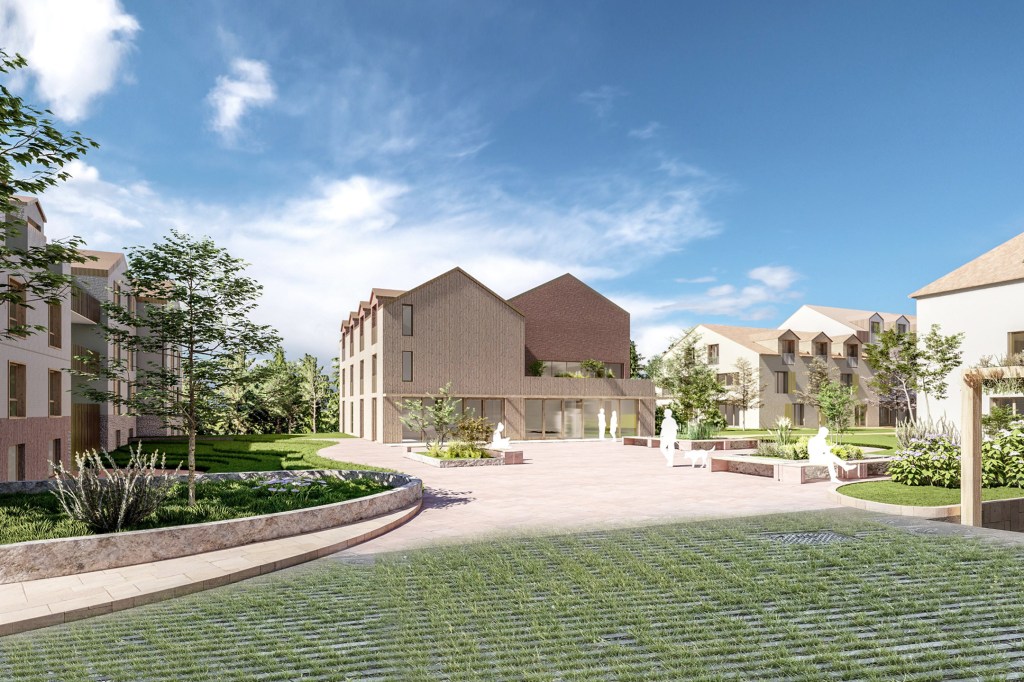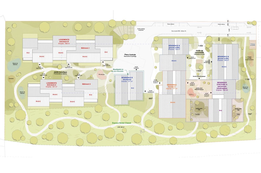 Des logements sociaux, deux résidences étudiantes, une résidence pour les seniors, une résidence pour des personnes atteintes du TSA et un commerce s’organisent autour de différentes places, chacune avec une intimité et une végétation qui lui est propre. Un vaste espace boisé a été conservé dans le projet qui fait le lien entre les différents espaces.