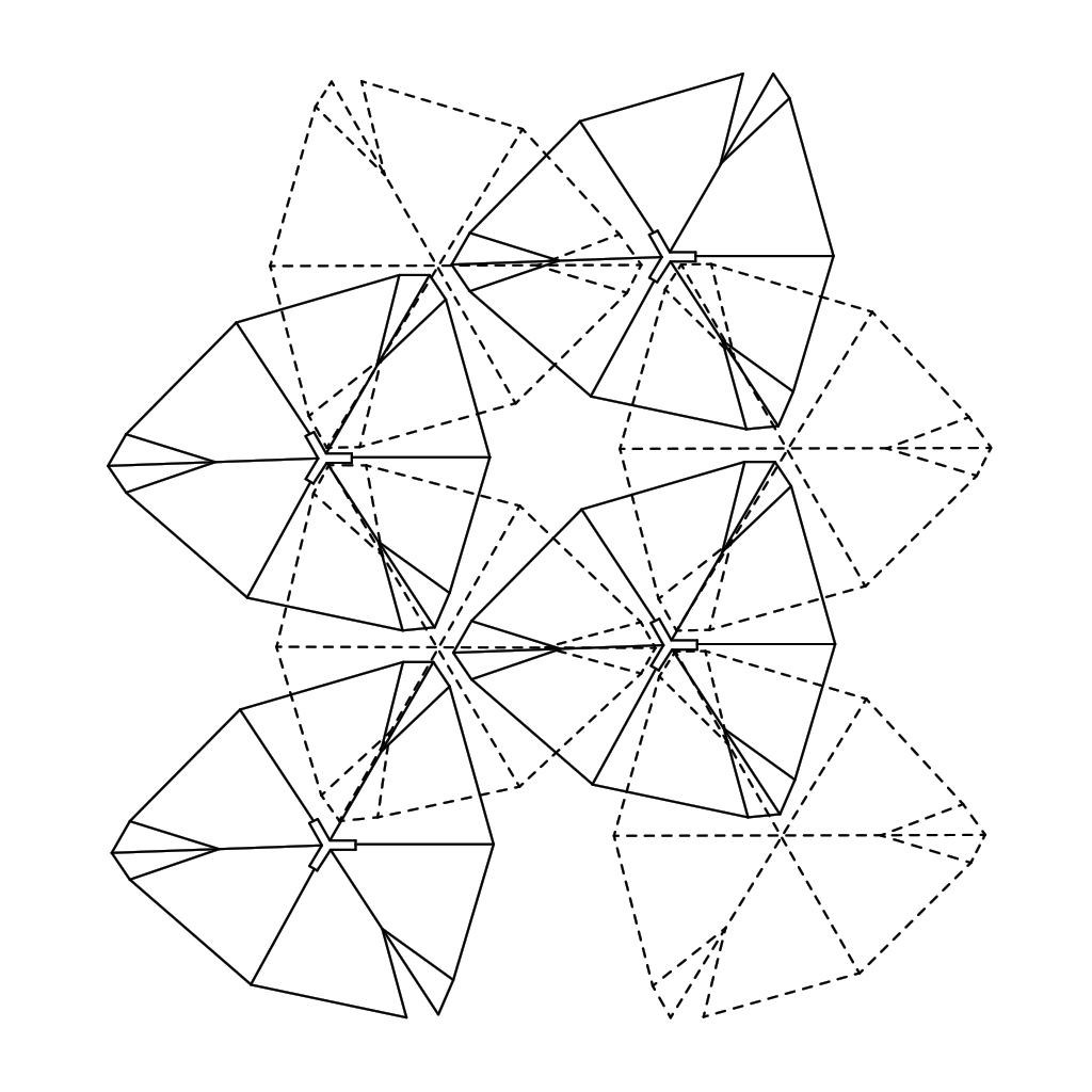 Le module initial est une tuile plate qui devient un volume par le pliage, un système inspiré de l’origami. L’assemblage de ces modules permettent de créer des murs ou des toits qui peuvent devenir courbes en ajustant les angles du pliage et la circonférence du module de base.