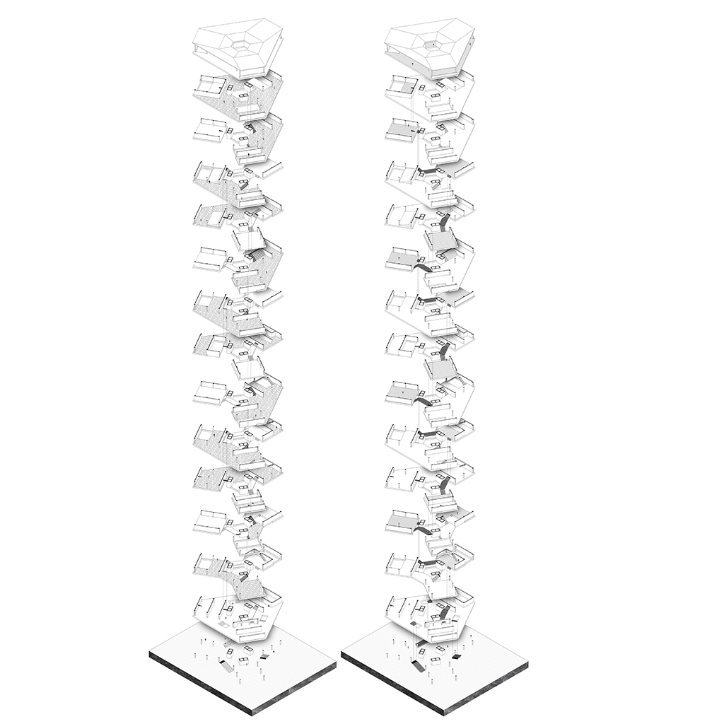 Matérialisés par des plateaux, ces nouveaux programmes sont les liens structurant de l’édifice et permettent l’ascension de la tour.